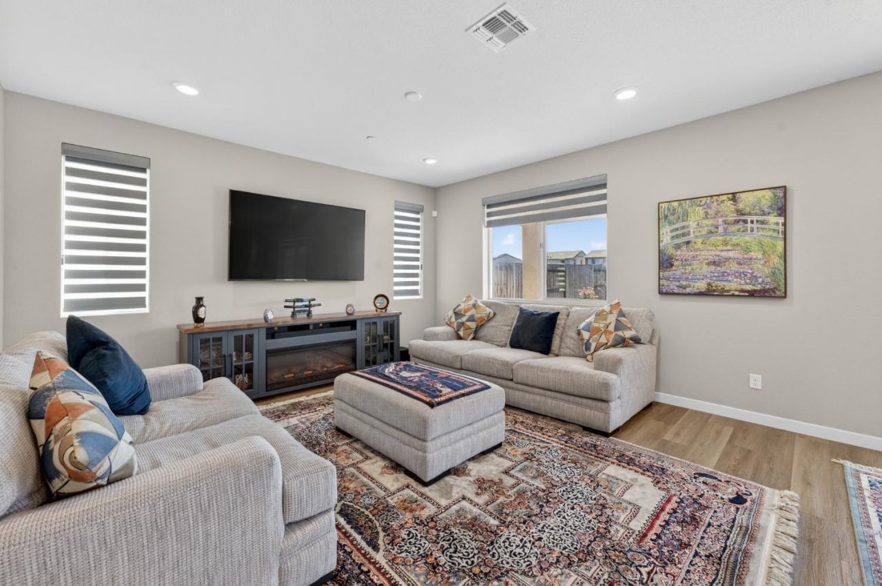 Step into this beautiful, spacious multi-generational home featuring a full bedroom and bathroom on the main level, all showcasing exceptional pride of ownership. Designed for both style and functionality, the kitchen is the heart of the home, offering an expansive island, sleek stone countertops, elegant shaker cabinetry, a charming backsplash, and a convenient breakfast bar for casual dining and entertaining. The flexible layout is ideal for multi-generational living. Upstairs, the primary suite serves as a private retreat with a spacious layout and a spa-inspired ensuite, complete with a double vanity and a large walk-in shower. The inviting living room centers around a cozy fireplace, creating a warm and welcoming atmosphere. Throughout the home, 14 Hunter Douglas thermal protection curtains enhance energy efficiency while adding a touch of quality and style. Outside, enjoy a durable tile roof and a fenced backyard designed for privacy and low-maintenance living. It features a covered patio and artificial turf, perfect for relaxing or entertaining year round. The welcoming patio provides an ideal space for gatherings or quiet moments of leisure. The garage is equipped with EV charging, adding modern convenience for today's lifestyle. Blending comfort, thoughtful design, and modern appeal, this home offers a truly refined living experience.