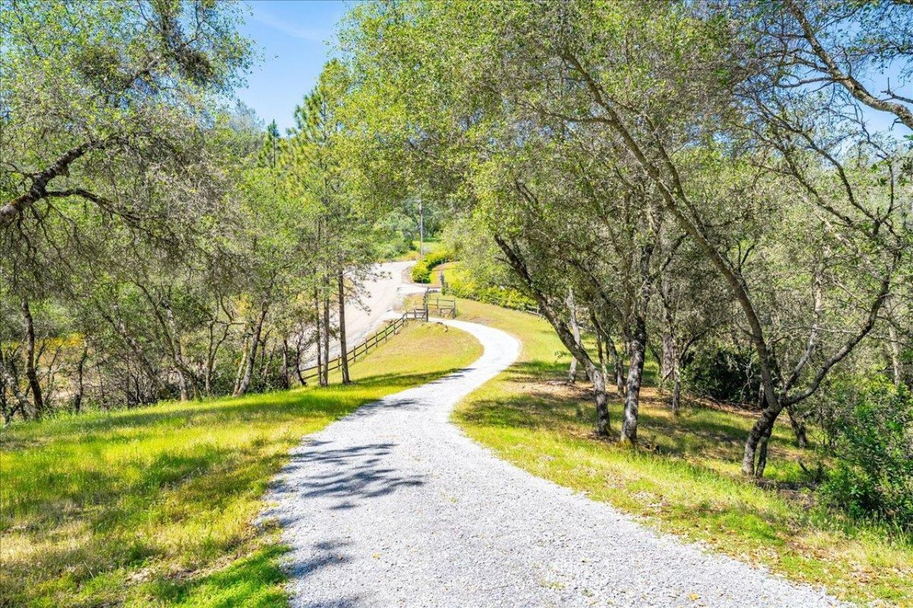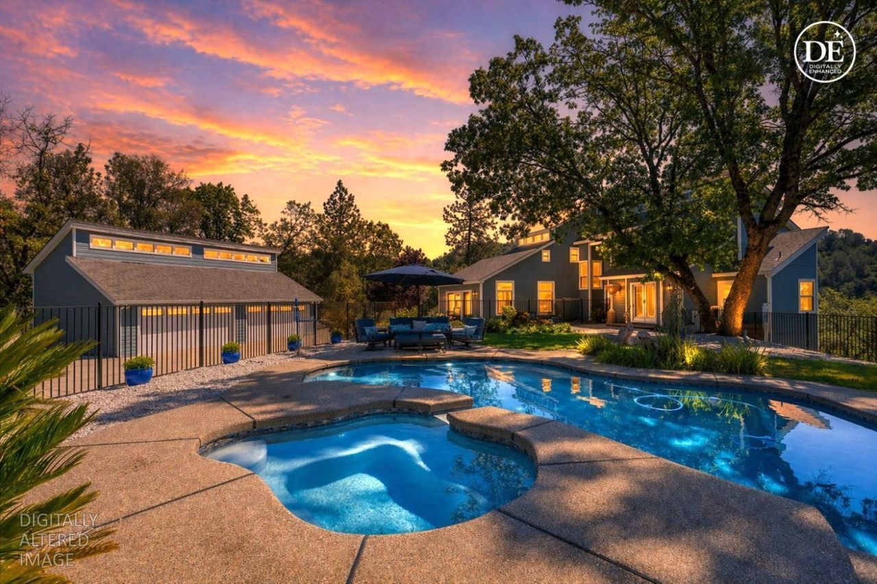 Perched on a private hilltop, this beautifully positioned 3,099 sq ft home captures the foothill lifestyle - space, views, and the ability to enjoy where you live. From the moment you arrive, the landscaped front yard and expansive paved access set the tone for ease and functionality, with abundant parking and a 1,000 sq ft detached 4-car garage complete with a 400 sq ft loft for storage or future vision. The heart of this special home opens to sweeping treetop and rolling hill views, with a thoughtfully designed kitchen featuring burnished maple cabinetry, granite counters, bar seating, a dedicated coffee bar, and a propane range with downdraft - perfectly oriented to stay connected to the living spaces and the view beyond. Multiple living areas, including a spacious den with half bath and exterior access, offer flexibility for a game room, office, or homeschool setup. The main level features two bedrooms and a full bath, ideal for guest or multi-generational living, with direct access to the backyard retreat. And this is where the property truly shines - your own private outdoor escape with a built-in pool (7.5 ft depth), heated by the adjoining spa with a waterfall feature, surrounded by intentional entertaining spaces and safety fencing for peace of mind. Upstairs, a versatile media loft -currently a home gym- leads to a primary suite that feels like a retreat within itself - soaring ceilings, a wood-burning fireplace, private heating and air system, and views that invite you to slow down. The ensuite bath is an experience, complete with a Maxx Aerofeel soaking tub with champagne bubble jets, a Carrera marble shower, and a generous walk-in closet. All of this with paved roads, privacy, and the simplicity of a modest road maintenance agreement - offering freedom without the constraints of a traditional HOA. This is foothill living done right.